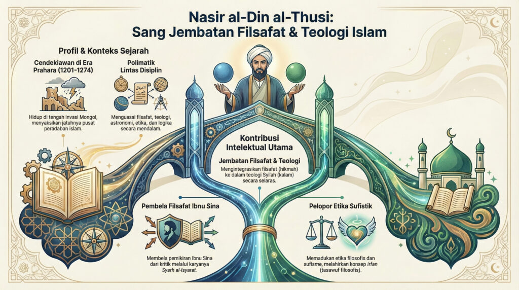 FILSAFAT Islam sebagai sebuah diskursus yang berpendar dari jantung nubuat berutang banyak eksposisi krusial yang menjelaskan pemikiran Ibn Sina yang penuh teka-teki dari sosok jenius Nasir Al-Din Thusi. Lahir di Thus (1201–1274)—Iran hari ini—mengarungi medan pertempuran membara saat invasi mongol ke dalam pusat-pusat peradaban Islam. Menyaksikan jebolnya benteng, pusat riset dan perpustakaan besar Alamut, yang dikelola oleh kalangan Syi’ah Isma’ili. Dia ditakdirkan menyaksikan runtuhnya Abbasiyah akhir dan Baghdad oleh Jengis Khan, dan sekaligus mampu meyakinkan Hulagu Khan untuk melanjutkan riset-risetnya dalam bidang filsafat alam sehingga orang dapat melihat bagaimana dia adalah manusia licin dengan kecerdasan yang pionir dalam politik dan filsafat. Sang filsuf dengan kepiawaiannya mengintegrasikan ilmunya ke dalam celah-celah sempit iklim intelektual keras dan tak menentu. Seakan-akan segala sesuatu yang bergerak di luar dirinya tidak lebih dari aksiden objek-objek samawi yang mengorbit di poros aktivitasnya.
